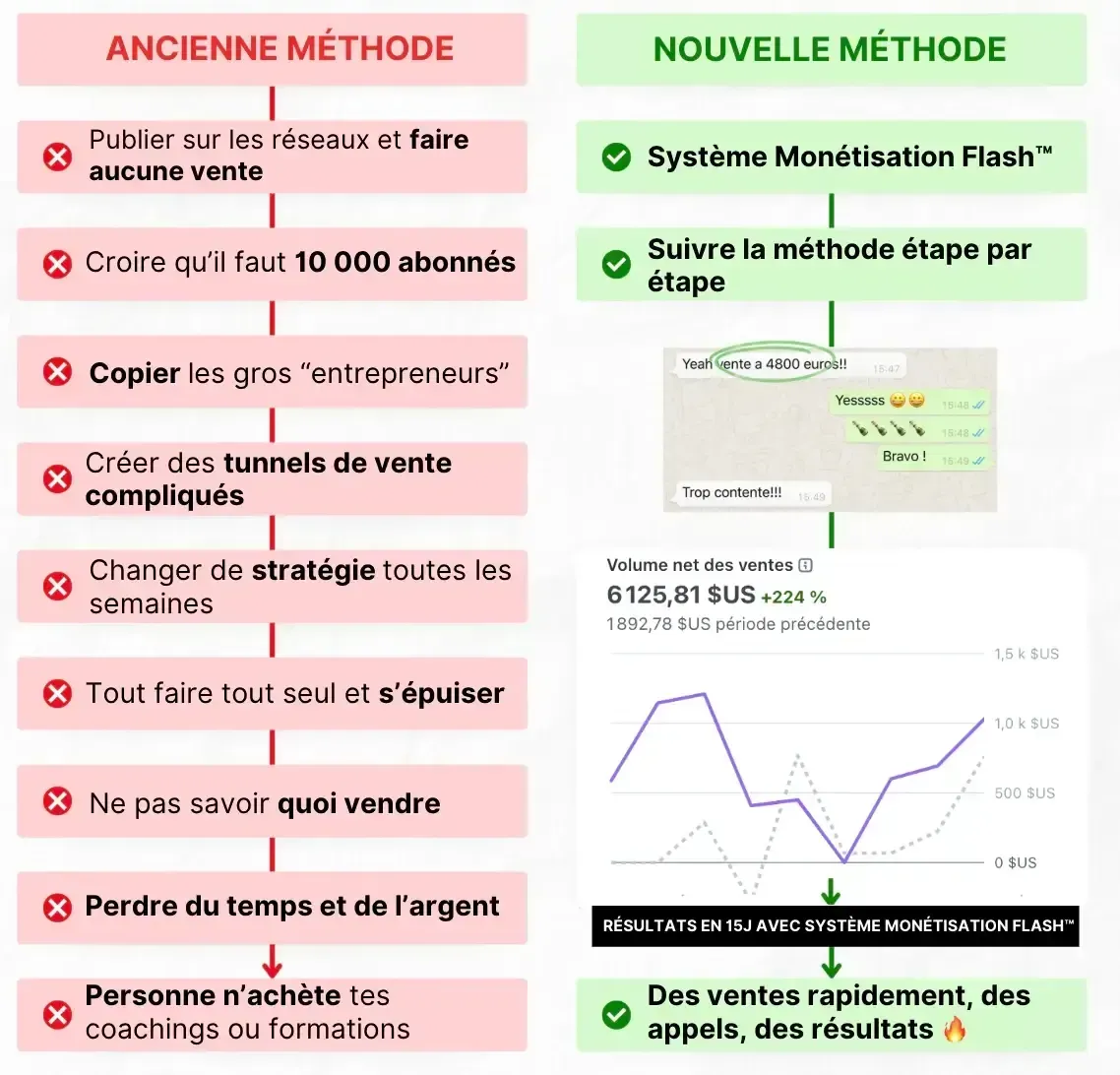 Avec le Système Monétisation Flash™, tu obtiens les mêmes stratégies et outils que mes clients premium pour seulement 17 €.